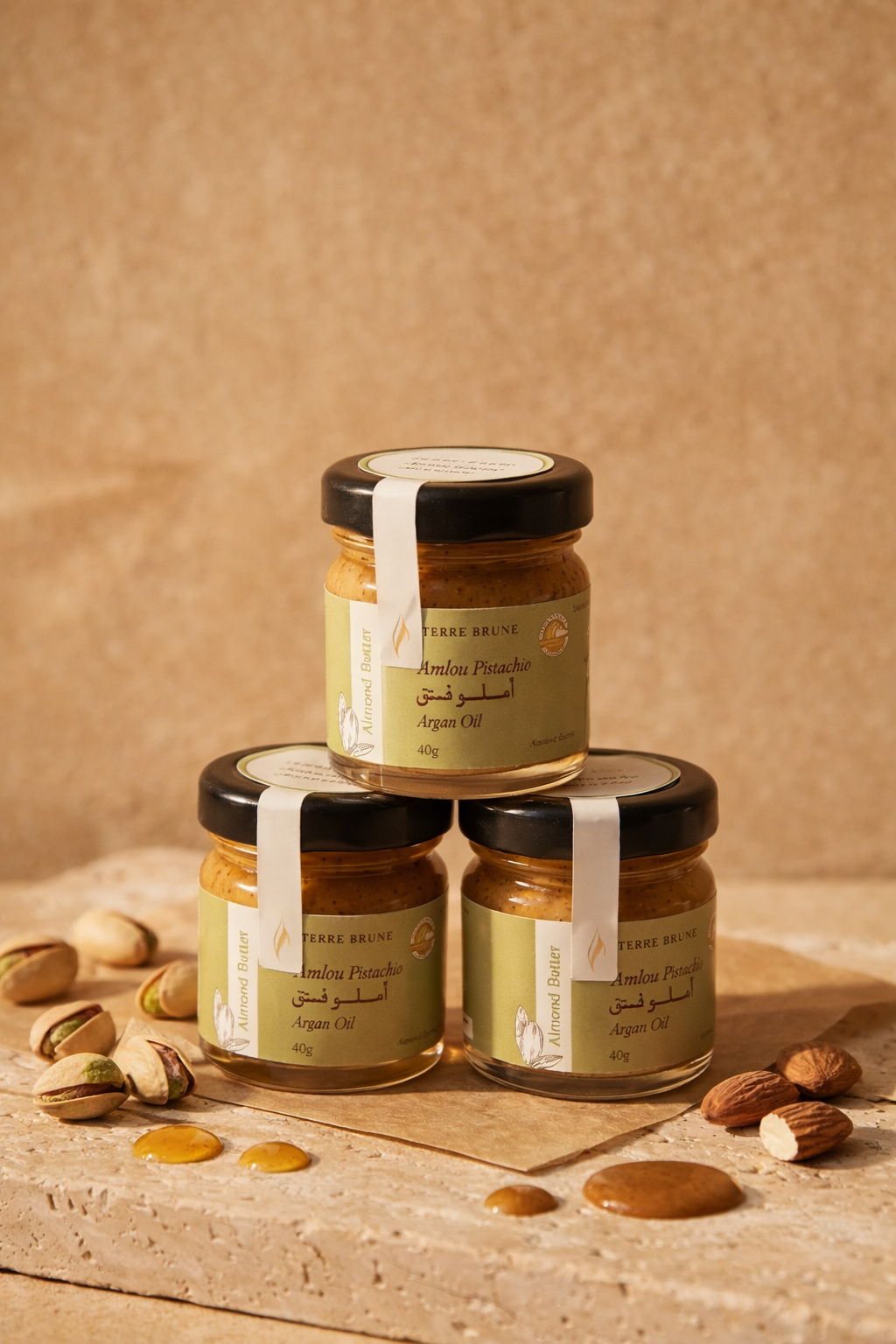Amlou Pistache is a delicious twist on the traditional Moroccan spread, blending finely ground pistachios and almonds with pure honey and argan oil for a smooth, creamy texture. Rich, nutty, and naturally sweet, it offers a unique flavor experience that feels both indulgent and wholesome. Perfect for spreading on warm bread, drizzling over desserts, or elevating your breakfast.
