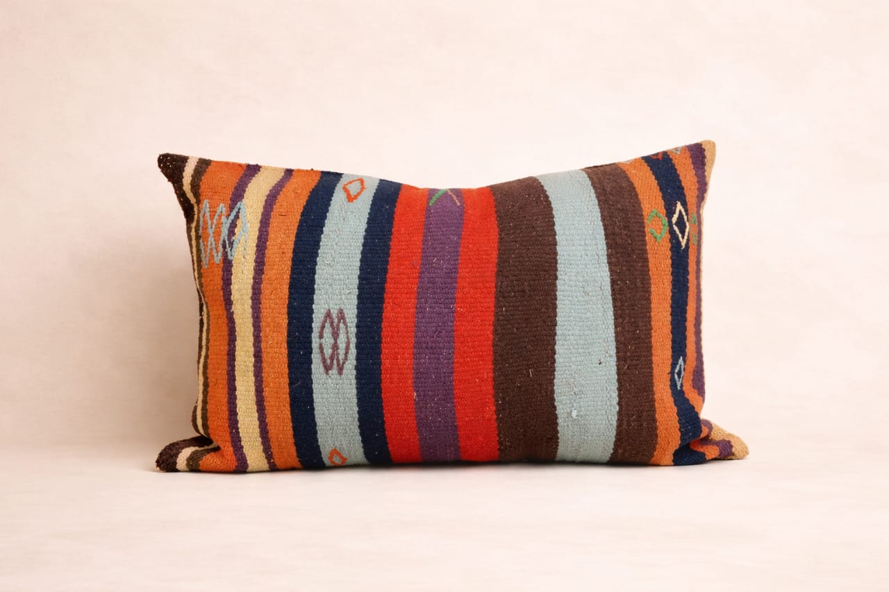 The Medina Grid Cushion is crafted from handmade traditional rugs, giving new life to richly woven textiles. Featuring bold striped patterns and subtle symbolic motifs, it reflects the vibrant rhythm and character of the medina. Each piece carries natural variations in color and texture, making it truly one of a kind. Warm, expressive, and full of heritage, this cushion adds depth and story to any space.