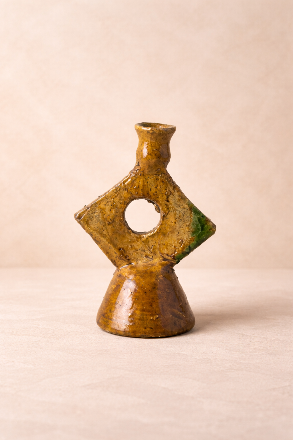 A sculptural Tamegroute candle holder with geometric form and rich, organic glaze.
